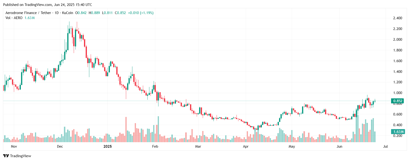 A significant catalyst for AERO’s recent performance was JP Morgan’s announcement on June 18, 2025, launching a USD-denominated deposit token (JPMD) on Base via Kinexys. This move endorses Base as a preferred platform for institutions, likely increasing total value locked (TVL) in Base and Aerodrome. An X post from Base highlight this as a major tailwind for Aero Crypto, potentially attracting more institutional flows and boosting AERO’s value.