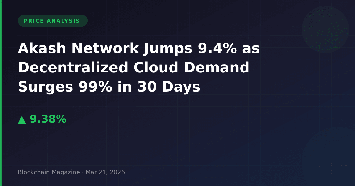 Akash Network (AKT) has posted a 9.4% gain in the past 24 hours, reaching $0.602 as of March 21, 2026. More striking than the daily move is the token’s 99% surge over the past 30 days, climbing from approximately $0.30 to current levels. We observe this rally accompanied by substantial volume expansion, with $38.8 million in trading activity representing a meaningful portion of the token’s $157.3 million market capitalization.