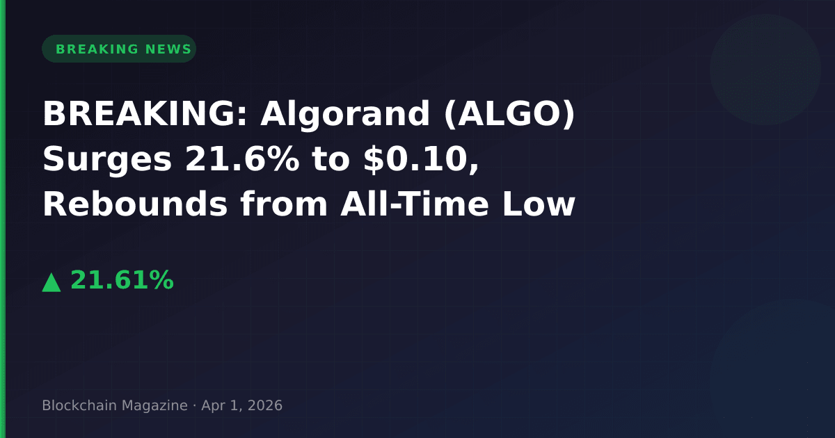 Algorand (ALGO) has posted a significant 21.6% price increase over the past 24 hours, reaching $0.100983 as of April 1, 2026, according to market data. The layer-1 blockchain protocol is showing strong recovery momentum after touching an all-time low of $0.080092 just three days ago on March 29.