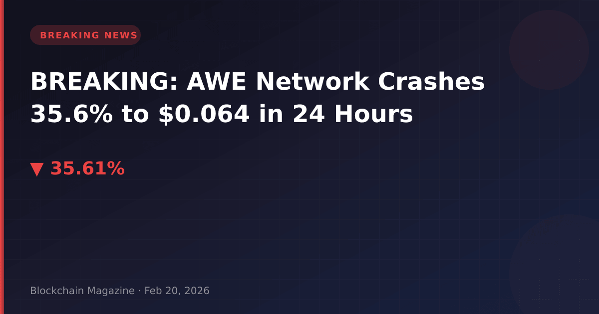 AWE Network (AWE) has experienced a severe price collapse, plunging 35.6% to $0.064118 in the past 24 hours, erasing approximately $68.4 million in market capitalization.