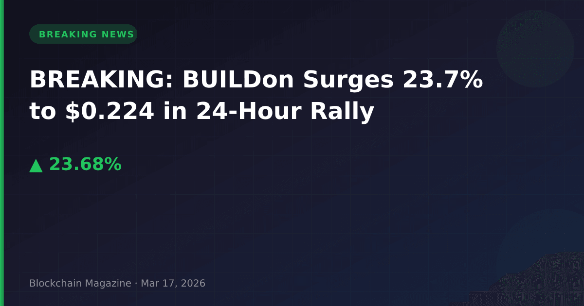 BUILDon (B) has experienced a significant price surge, jumping 23.7% in the past 24 hours to reach $0.224082 as of March 17, 2026. The cryptocurrency’s market capitalization has increased by $43.3 million, reaching $224.1 million and placing it at rank #170 among all cryptocurrencies.