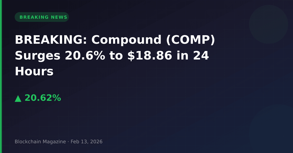 BREAKING: Compound’s governance token (COMP) has surged 20.6% in the past 24 hours, trading at $18.86 as of 16:06 UTC on February 13, 2026, according to live market data.