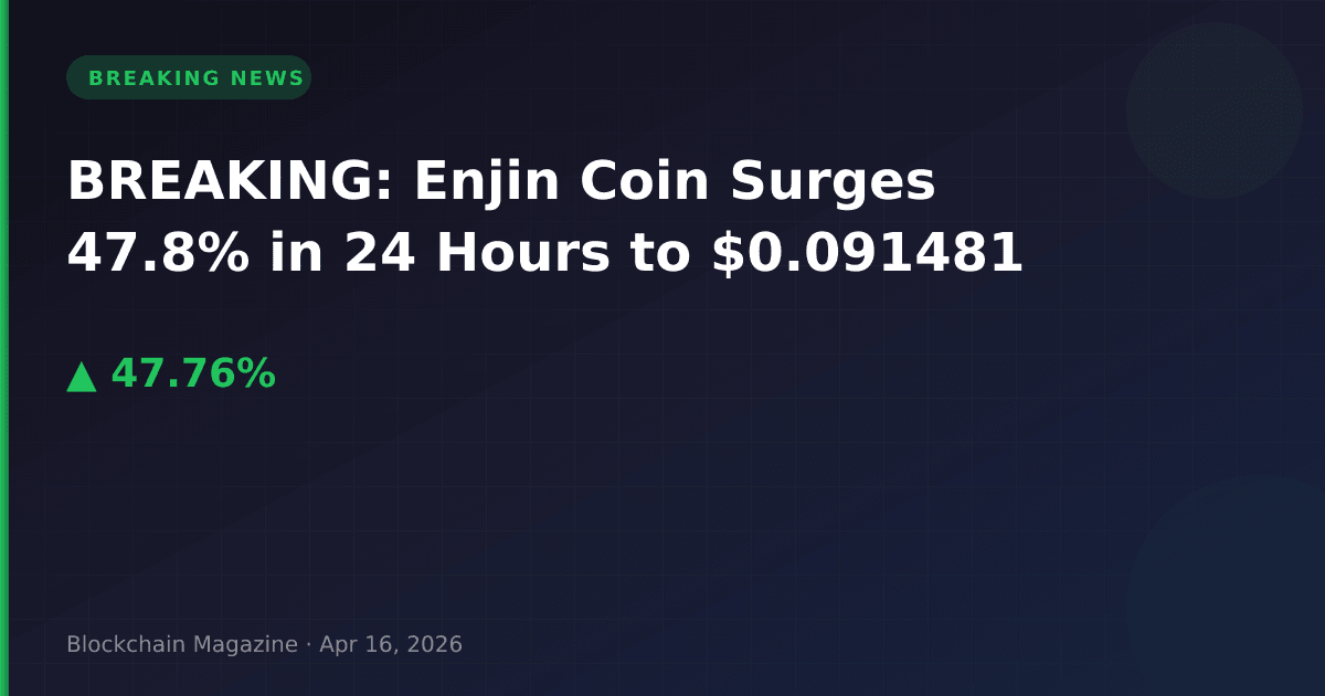 Enjin Coin (ENJ) is experiencing a dramatic price surge, climbing 47.8% in the past 24 hours to reach $0.091481 as of April 16, 2026. The NFT gaming token has captured significant market attention with trading volume exploding to $694.9 million.