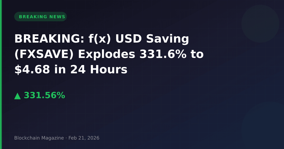 f(x) USD Saving (FXSAVE) has experienced an extraordinary rally, surging 331.6% in 24 hours to reach $4.68 as of February 21, 2026, according to real-time market data.