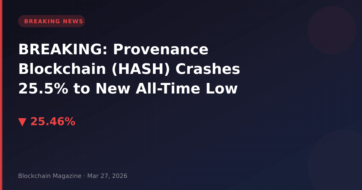 BREAKING: Provenance Blockchain (HASH) has experienced a severe market collapse, plunging 25.5% in the past 24 hours to trade at $0.00955954 as of 3:07 PM UTC on March 27, 2026. The dramatic decline has pushed the token to a new all-time low, recorded just minutes earlier at $0.00956298.