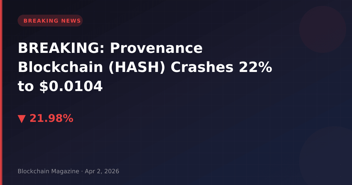 Provenance Blockchain (HASH) experienced a sharp 22% decline in the past 24 hours, dropping to $0.01038465 as of 10:52 UTC on April 2, 2026. The enterprise blockchain token saw its market capitalization fall by $164.4 million to $585.5 million, maintaining its position as the 89th largest cryptocurrency by market cap.
