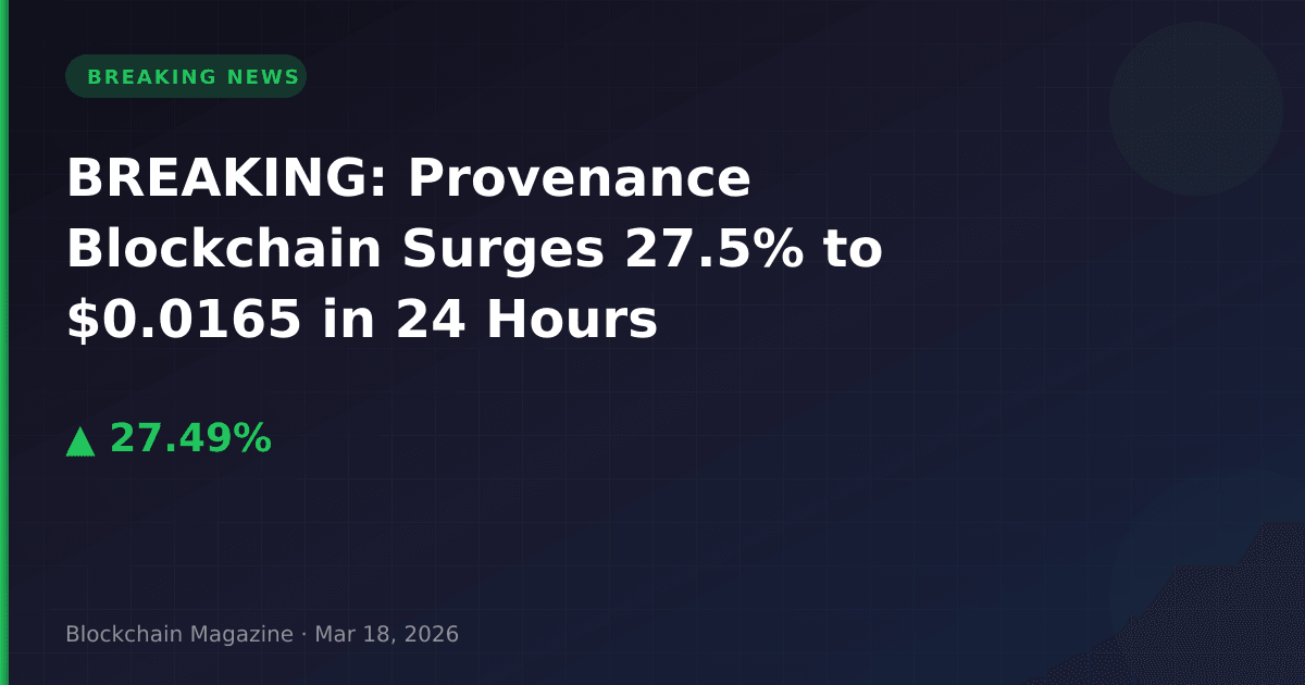 Provenance Blockchain (HASH) experienced a sharp rally on March 18, 2026, climbing 27.5% over 24 hours to reach $0.01647089, with momentum accelerating to a 33.7% gain in just the last hour.