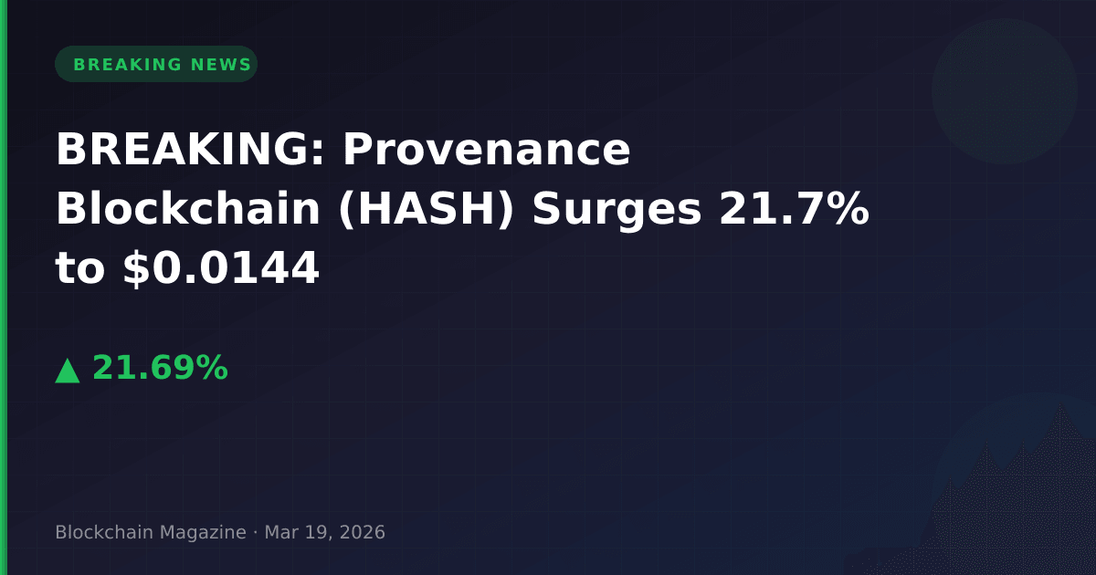 BREAKING: Provenance Blockchain (HASH) has experienced a significant price surge, climbing 21.7% in the past 24 hours to reach $0.01443239 as of March 19, 2026.