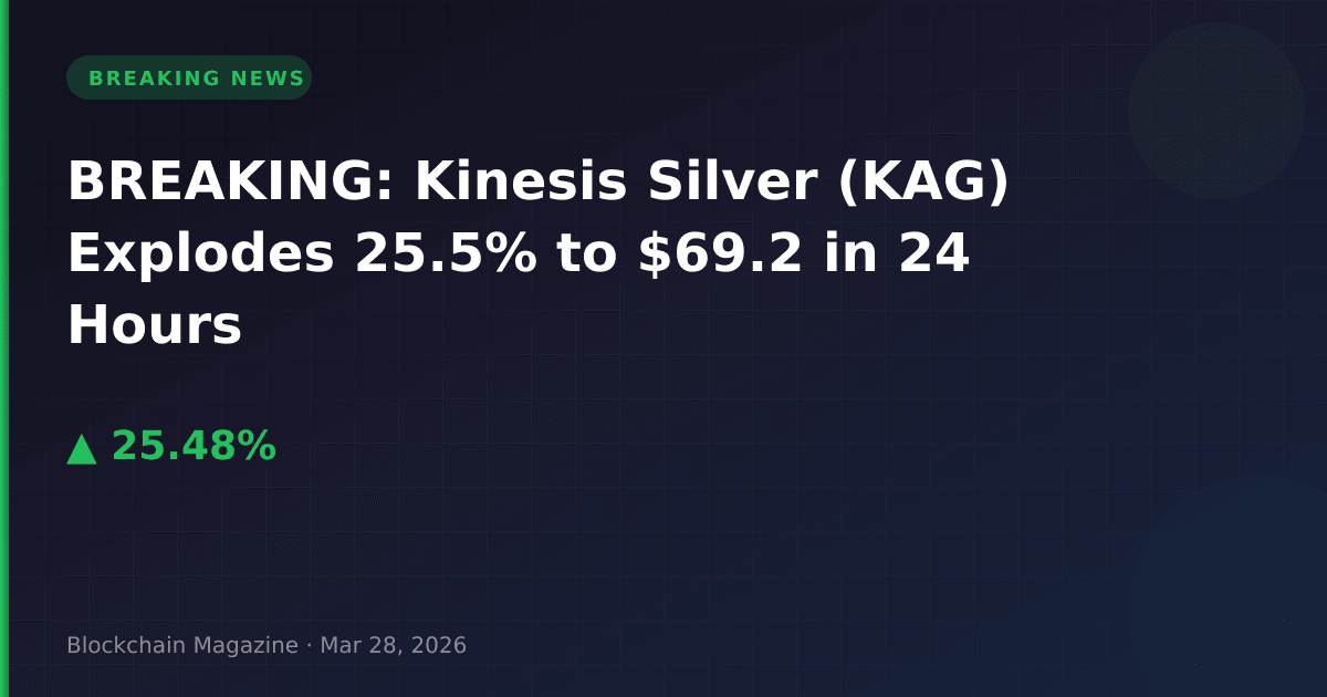 March 28, 2026 – Kinesis Silver (KAG), a cryptocurrency backed by physical silver bullion, has experienced a dramatic 25.5% price surge in the past 24 hours, reaching $69.20 per token as of 15:37 UTC today.