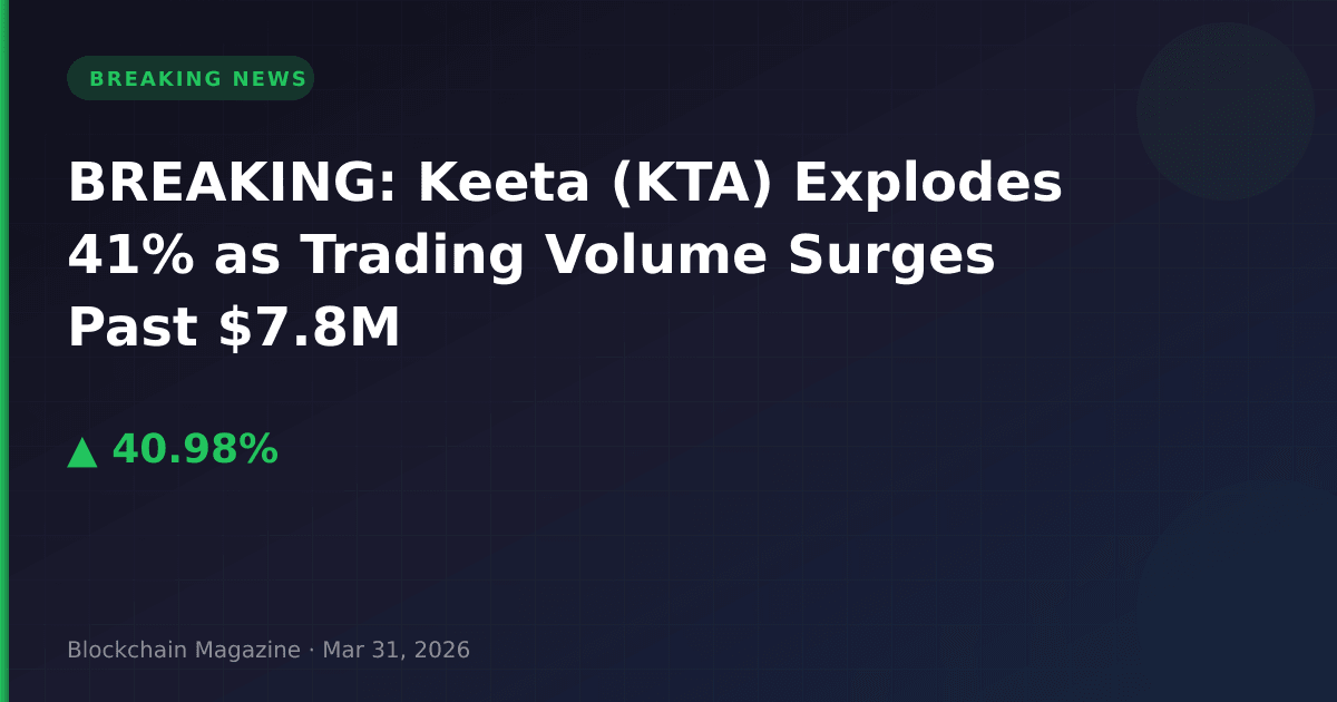 BREAKING UPDATE: Keeta (KTA) has experienced a dramatic 41% price surge in the past 24 hours, reaching $0.212899 as of 12:22 PM UTC on March 31, 2026. The token’s market capitalization has jumped $31.8 million to $109.19 million, securing the #250 ranking among all cryptocurrencies.