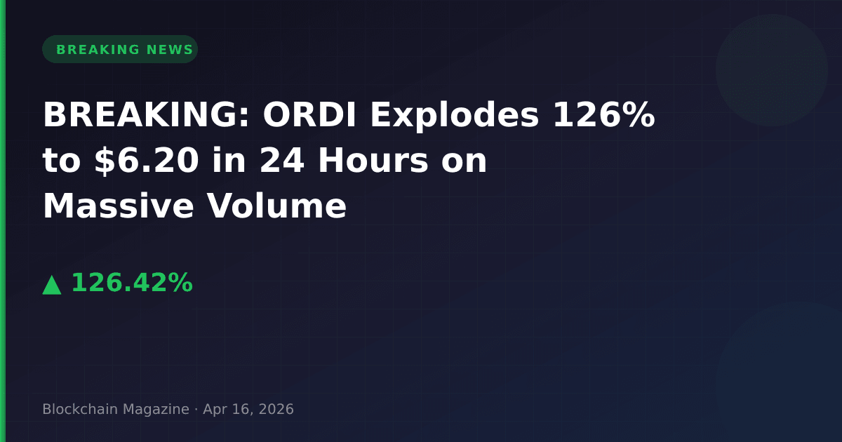 ORDI (Ordinals) has surged 126.4% in the past 24 hours to reach $6.20, marking one of the most dramatic price movements in the cryptocurrency market today. The token posted a 24-hour trading volume of $491.5 million, reflecting intense market interest.