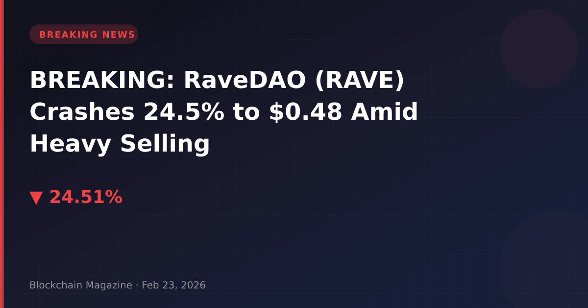 RaveDAO (RAVE) has experienced a dramatic price collapse, plunging 24.5% in the past 24 hours to $0.481976, according to latest market data updated February 23, 2026.