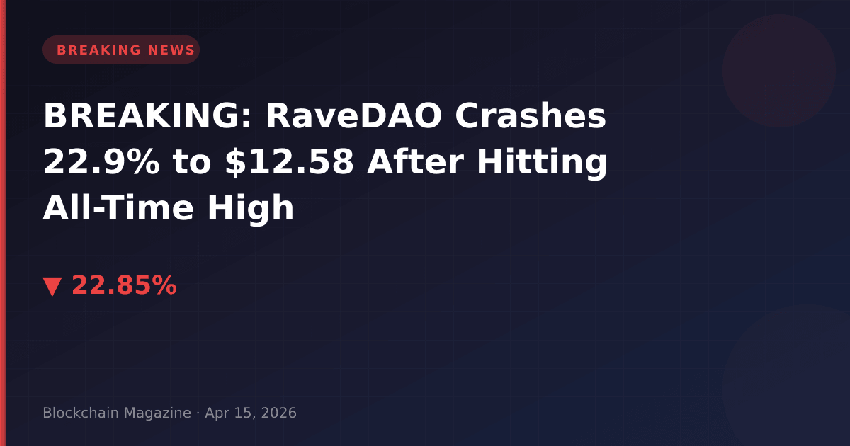 RaveDAO (RAVE), the #34 ranked cryptocurrency by market capitalization, experienced a severe price collapse on April 15, 2026, plummeting 22.9% to $12.58 within hours of achieving its all-time high of $19.54 earlier today.