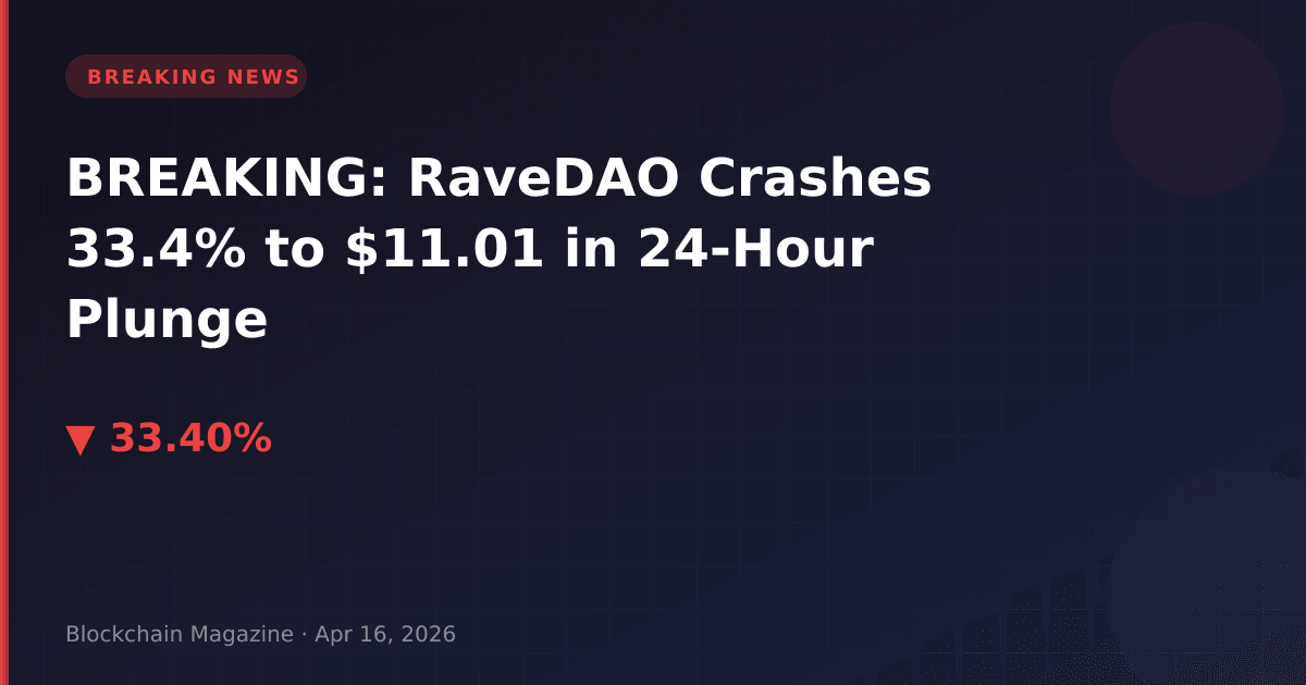 RaveDAO (RAVE) experienced a dramatic collapse on April 16, 2026, plunging 33.4% to $11.01 and erasing $1.37 billion in market capitalization in a sharp reversal just one day after hitting its all-time high.