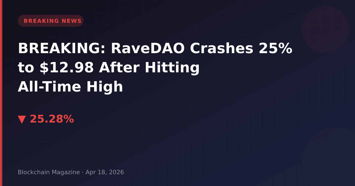 April 18, 2026 – RaveDAO (RAVE) experienced a dramatic reversal today, plunging 25.3% to $12.98 after reaching an all-time high of $27.88 just hours earlier, marking one of the most volatile sessions in the token’s brief history.