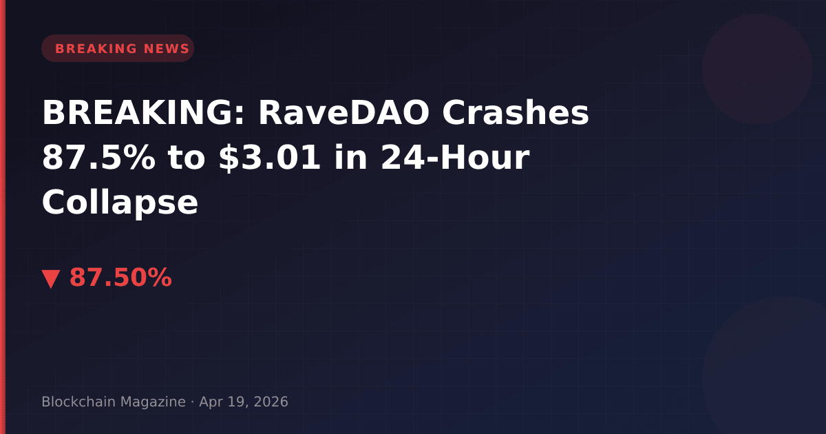 BREAKING NEWS: RaveDAO (RAVE) has suffered one of the most severe single-day crashes in recent crypto market history, plunging 87.5% to $3.01 as of April 19, 2026, according to real-time market data.