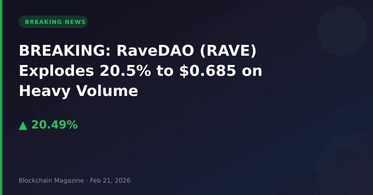 RaveDAO (RAVE) has posted a dramatic 20.5% surge in the past 24 hours, reaching $0.685003 as of 22:07 UTC on February 21, 2026, with trading volume spiking to $60.3 million.