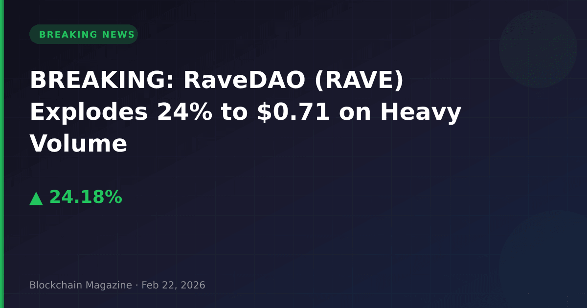 RaveDAO (RAVE) has exploded 24.2% higher in the past 24 hours, reaching $0.711125 as of 14:36 UTC on February 22, 2026, with trading volume surging to $75.87 million.