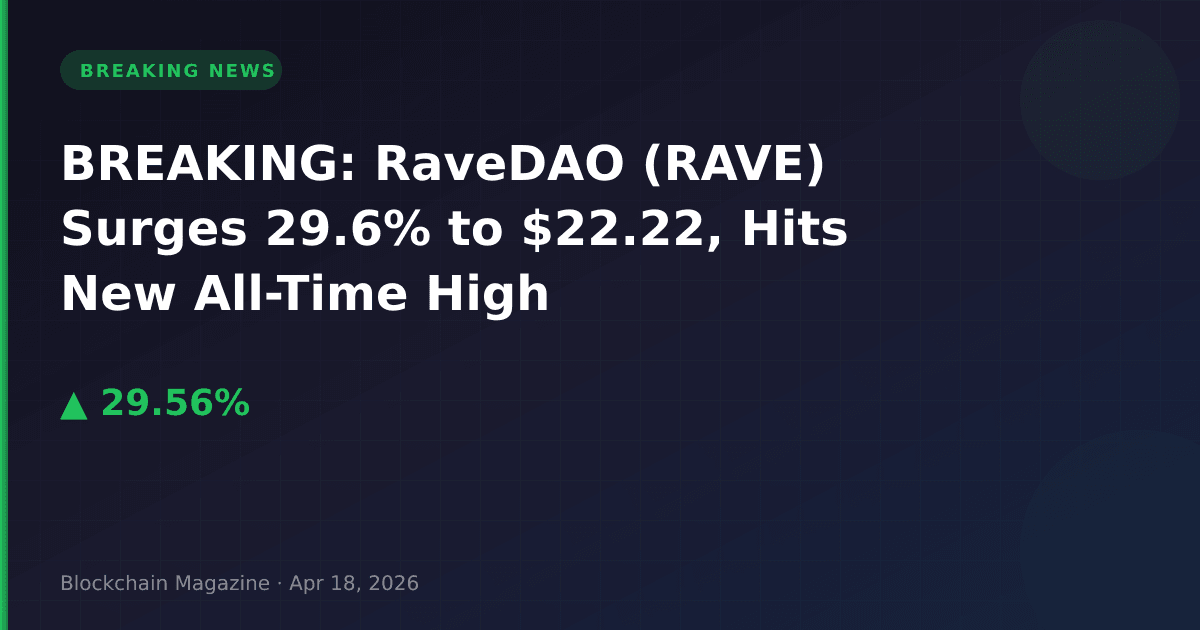 RaveDAO (RAVE) has surged 29.6% in the past 24 hours to reach $22.22, marking a new all-time high for the decentralized autonomous organization token.