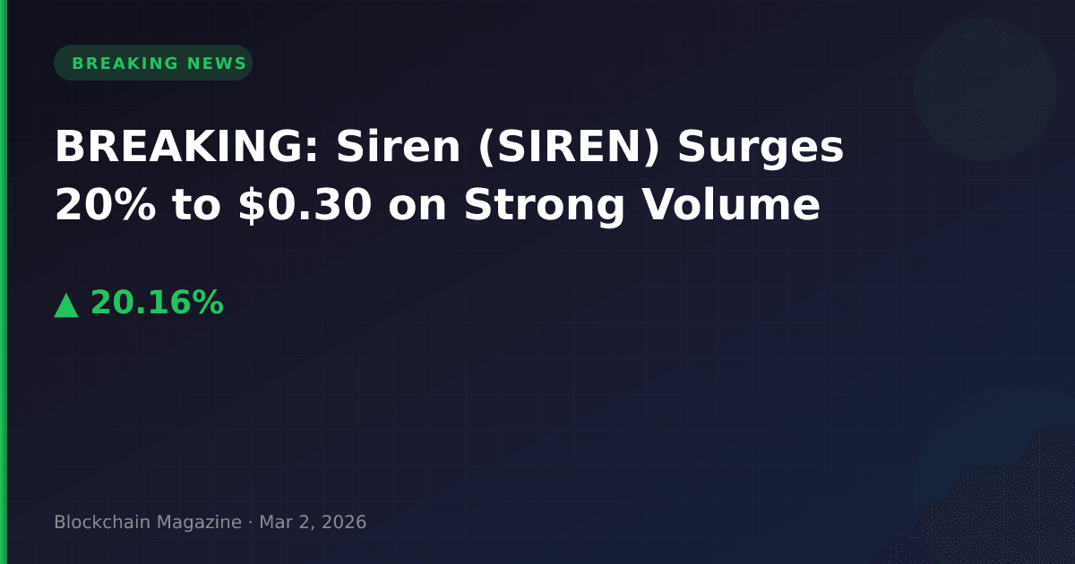 Siren (SIREN) has experienced a sharp rally, surging 20.2% over the past 24 hours to reach $0.30182 as of 09:52 UTC on March 2, 2026. The cryptocurrency’s market capitalization has climbed to $223.09 million, positioning it at rank #163 among all digital assets.