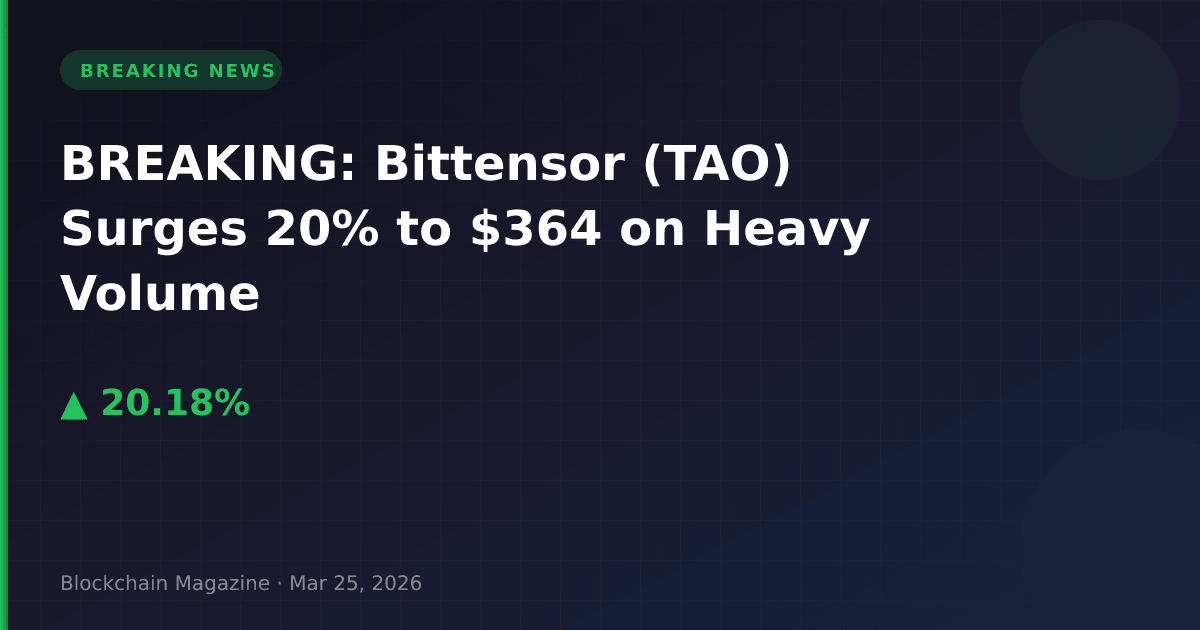 Bittensor (TAO) has exploded 20.2% in the past 24 hours to $364.38, marking one of the strongest single-day performances among top-50 cryptocurrencies. The AI-focused blockchain token has posted $942 million in trading volume, representing significant market interest in the decentralized machine learning protocol.
