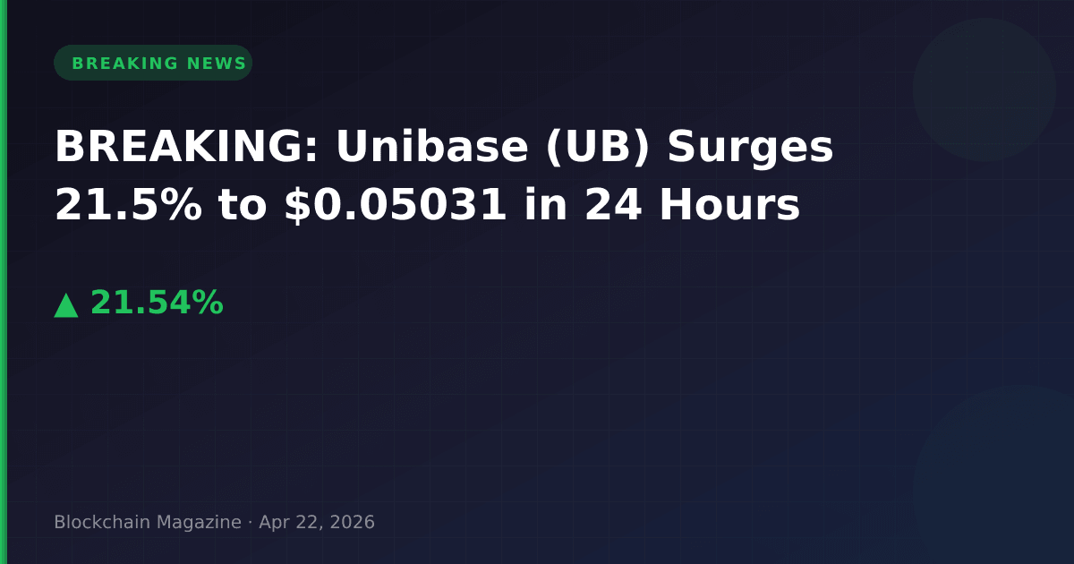Unibase (UB) has experienced a significant price surge, climbing 21.54% in the past 24 hours to reach $0.05031, according to live market data updated April 22, 2026. The sharp rally has pushed the token’s market capitalization to $125.8 million, ranking it #244 among all cryptocurrencies.