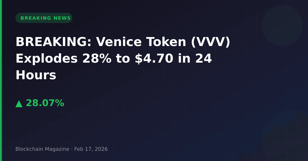 Venice Token (VVV) has exploded 28.1% in the past 24 hours, surging from $3.67 to $4.70 as of February 17, 2026, 6:36 PM UTC, according to real-time market data.