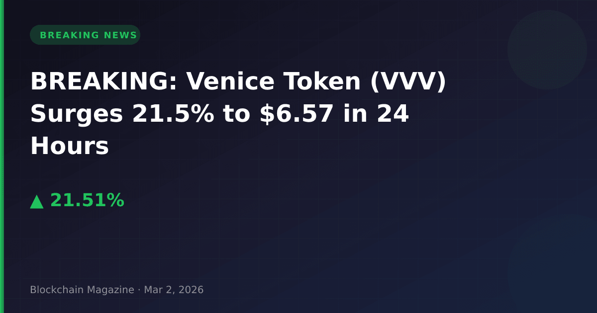 Venice Token (VVV) has surged 21.5% in the past 24 hours to $6.57, with trading volume reaching $38.8 million as the cryptocurrency continues its remarkable rally into March 2026.
