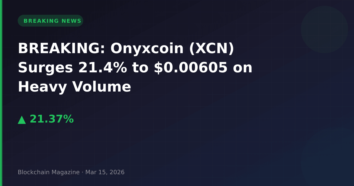 Onyxcoin (XCN) has experienced a significant price surge, jumping 21.4% in the past 24 hours to reach $0.00605099 as of March 15, 2026, 13:38 UTC. The rally has propelled the cryptocurrency’s market capitalization to $227.4 million, positioning it at rank #161 among all digital assets.