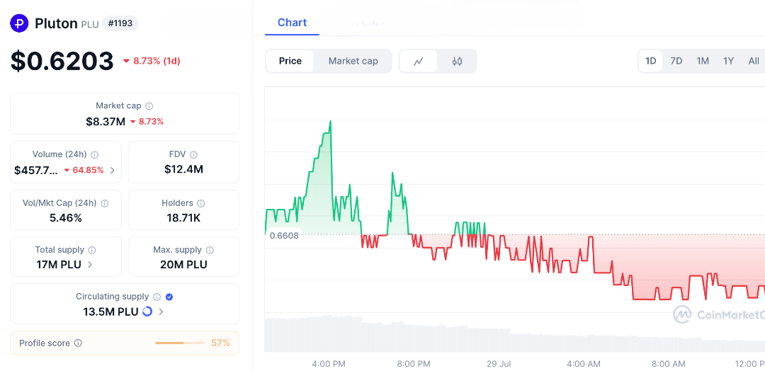 As of July 29, 2025, Pluton Crypto trades around $0.66, with a market cap near $7 million and daily volume often exceeding $1 million.