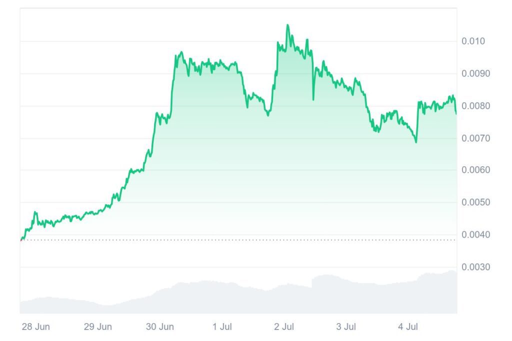 Current Price: Approximately $0.007735 USD, with a 24-hour trading volume of $54 million.