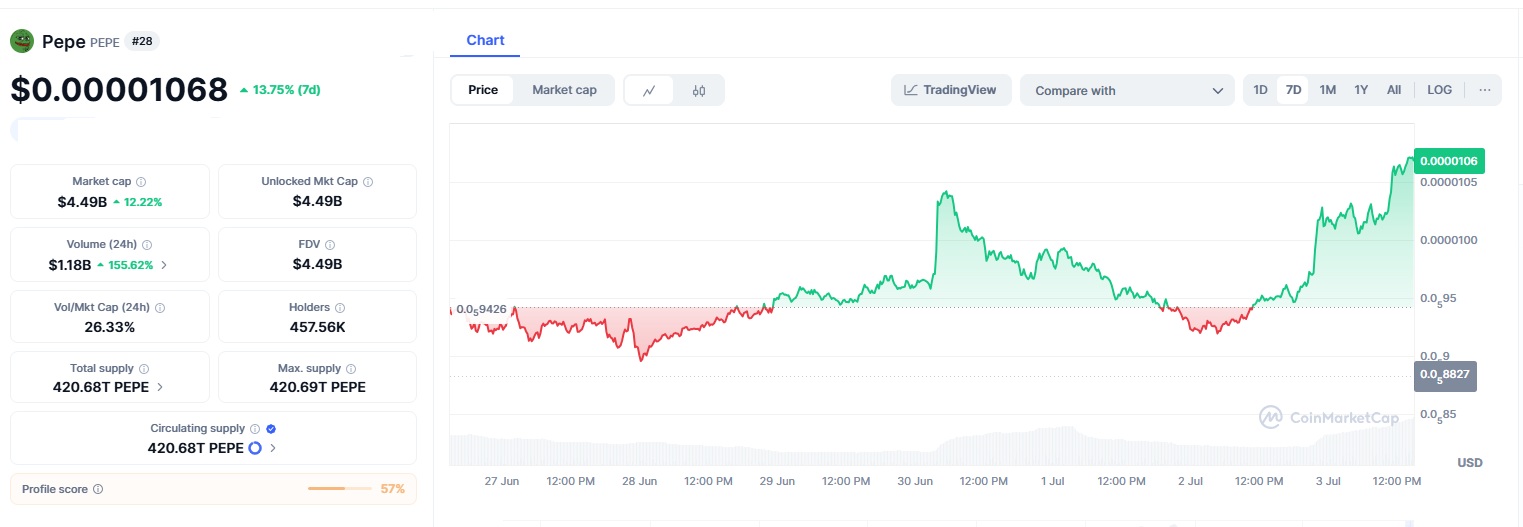 As of July 3, 2025, PEPE Coin (PEPE) is trading at approximately $0.00001068, reflecting an 13.75% gain over the past 7 days. The token’s market capitalisation stands at $4.49 billion, with an impressive 24-hour trading volume of $1.18 billion, marking a massive 155% increase in daily activity.