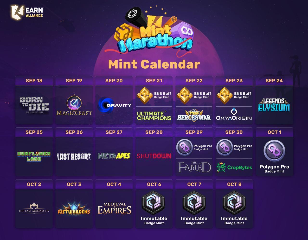 Earn Alliance, the largest web3 game aggregator and discoverability platform, is excited to announce the first-of-its-kind Mint Marathon event. The event will span three weeks, running from 18 September to 8 October 2023. During this period, users will have the exclusive opportunity to mint free NFTs from 16 games, with each week dedicated to a different blockchain network: Binance, Polygon, and Immutable.