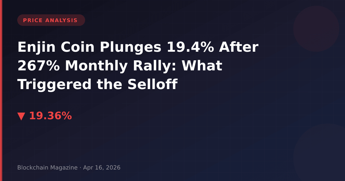 Enjin Coin (ENJ) registered a dramatic 19.4% price decline on April 16, 2026, dropping from an intraday high of $0.098324 to $0.073912—its lowest point in 24 hours. What makes this correction particularly noteworthy isn’t the magnitude of the drop, but rather the context: ENJ had surged 267% over the preceding 30 days and 144% in the past week alone, suggesting this selloff represents a technical correction rather than a fundamental shift in the gaming token’s trajectory.