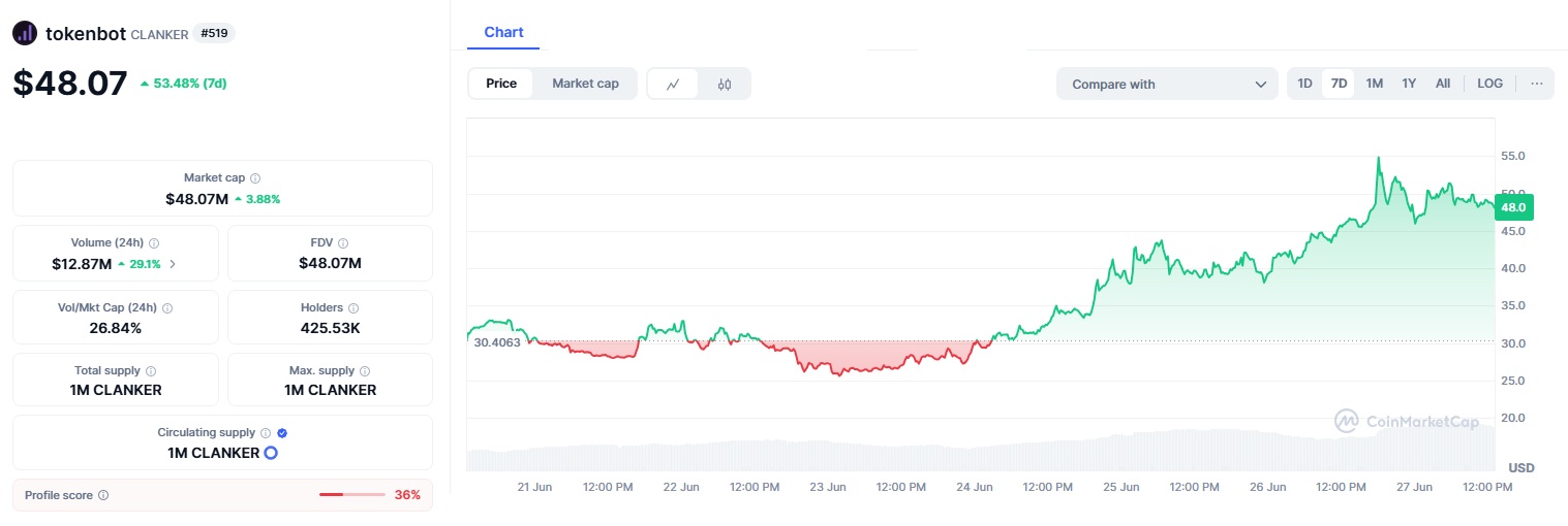 As of June 2025, Tokenbot (CLANKER) is trading at around $48 USD, with a market cap near $48.7 million and a 24-hour trading volume of $13 million. This shows it’s actively traded and has healthy market activity.