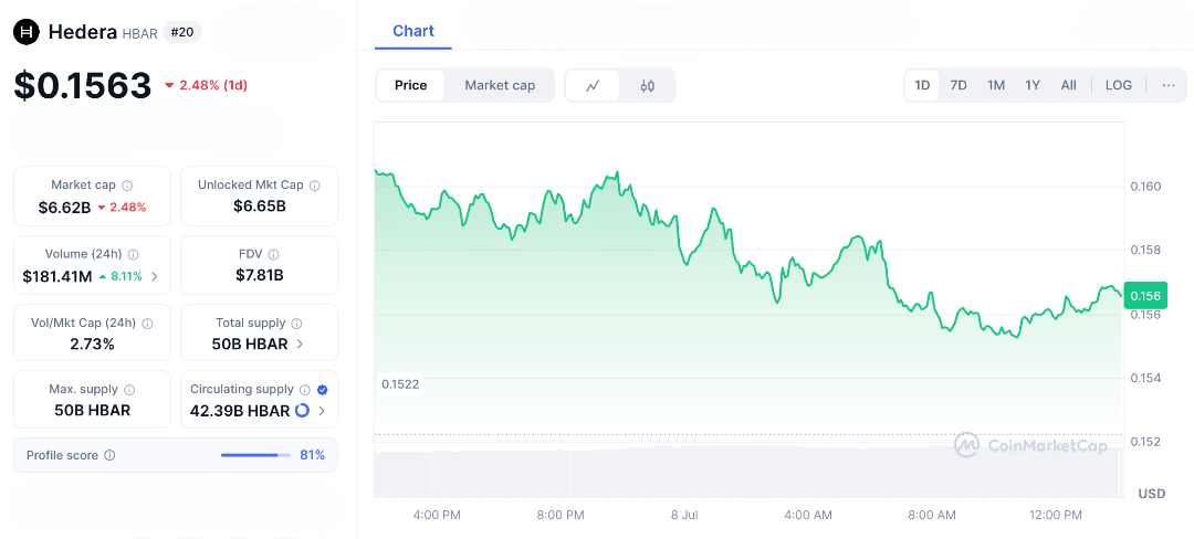 As of July 8, 2025, HBAR has a market cap of about $6.62 billion and sits at #20 on the global crypto rankings . While its current price of $0.15 is still far from its all-time high of $0.5701 (hit in September 2021), recent momentum in the broader crypto market has investors eyeing a potential comeback especially if the SEC greenlights the long-awaited spot HBAR ETFs.