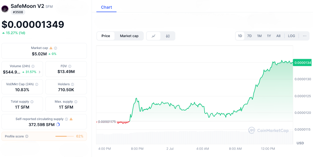 As of July 2, 2025, Safemoon V2 trades at around $0.000013 USD, with a 24-hour trading volume of $562K and a market cap of about $5 million. These figures indicate that Safemoon is in the smaller market cap category, showing moderate trading activity but also high volatility and risk.