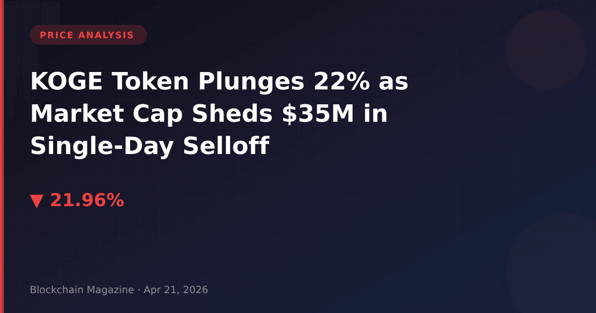 KOGE token suffered a precipitous 22% decline over the past 24 hours, with its price falling from $48.02 to $37.47 as of April 21, 2026. The selloff erased $35.3 million from its market capitalization, dropping from approximately $162 million to $127 million. What caught our attention wasn’t just the magnitude of the decline, but the accompanying volume spike to $4.88 million—suggesting this wasn’t ordinary profit-taking but rather a coordinated exit or forced liquidation event.
