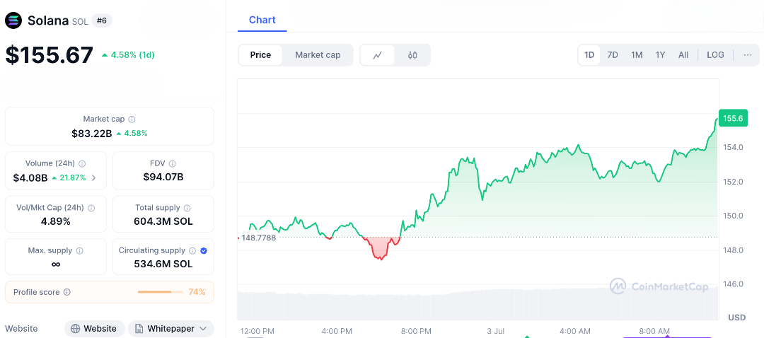 As of July 3, 2025, Solana (SOL) is trading at around $155.67 USD, with a market cap of approximately $83 billion and a 24-hour trading volume exceeding $4.08 billion . The price has gained 4.58% in the last 24 hours and shows steady growth with a 7-day increase of 2.2%.