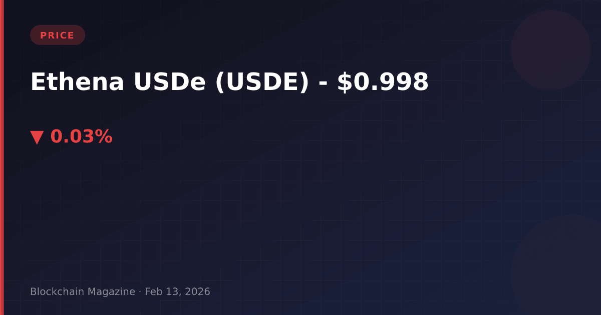 Ethena USDe (USDE) is trading at $0.998198 as of 2026, demonstrating the stability characteristics expected from a synthetic dollar protocol. Currently ranking #17 by market capitalization with $6.33 billion in total value, USDE maintains its peg within a tight range of the $1.00 target. The 24-hour price movement shows a marginal -0.03% decline, while the token has experienced minimal volatility over extended periods with +0.03% weekly gains and -0.14% monthly movement.