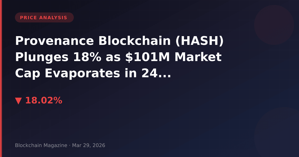 Provenance Blockchain (HASH) has suffered a sharp 18.02% price decline over the past 24 hours, dropping from $0.0137 to $0.0112 as of March 29, 2026. More concerning than the percentage drop itself is the $101.5 million in market capitalization that evaporated during this period—a 13.84% reduction that signals potential fundamental weakness rather than mere price volatility.