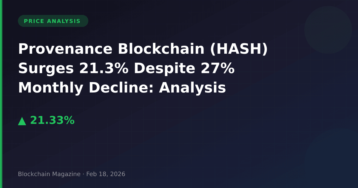 Provenance Blockchain (HASH) delivered one of the day’s most impressive performances with a 21.3% surge, yet our analysis reveals troubling volume dynamics that suggest this rally may be more fragile than headline numbers indicate. Trading at $0.0199 as of February 18, 2026, HASH has added $192 million to its market capitalization in just 24 hours—but with daily trading volume of only $107,498, we observe a concerning 10,137:1 ratio of market cap to volume that raises serious liquidity questions.