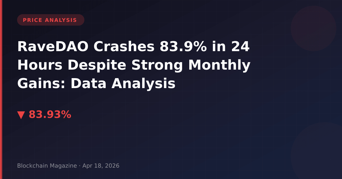 RaveDAO (RAVE) recorded what we calculate as one of the sharpest single-day corrections in the crypto market this year, collapsing 83.9% from $27.88 to $3.48 between April 17-18, 2026. The decline erased $4.5 billion in market capitalization within a 24-hour window, dropping the project from what would have been a top-50 position to rank #77. What makes this crash particularly noteworthy isn’t just the magnitude—it’s the timing, occurring against a backdrop of extraordinary 30-day gains exceeding 1,267%.