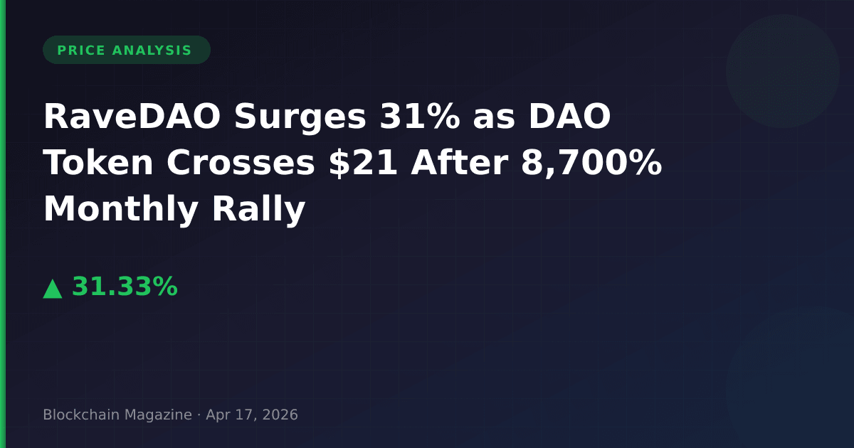 RaveDAO’s remarkable 31.3% daily price increase to $21.63 positions this governance token among the top-25 cryptocurrencies by market capitalization. However, our analysis of the underlying metrics reveals a more complex narrative than the headline numbers suggest.