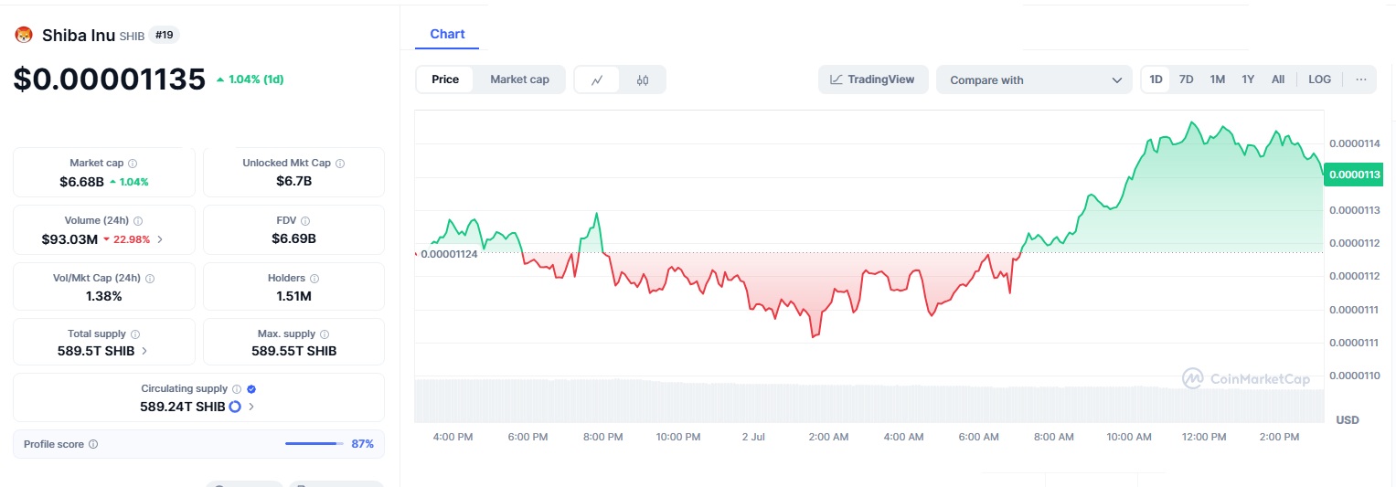 Market sentiment in 2025 has been increasingly favourable toward meme coins, and Shiba Inu (SHIB) is riding that wave. As of July 2, 2025, SHIB is trading at $0.000011, with a market cap exceeding $6.7 billion a sign of resilience amid crypto’s natural volatility. These numbers reflect growing confidence, even as the market remains sensitive to macro shifts.