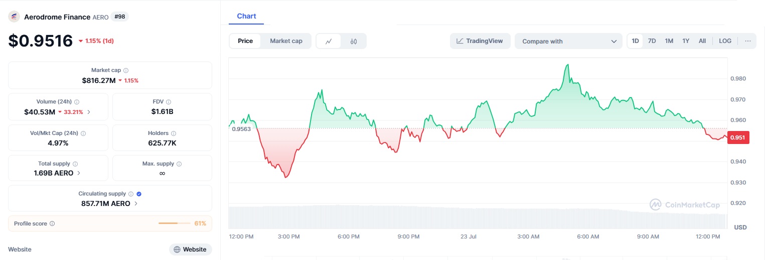 As of today, Aerodrome Crypto’s AERO token is trading around $0.94, having touched a recent high near $0.96.