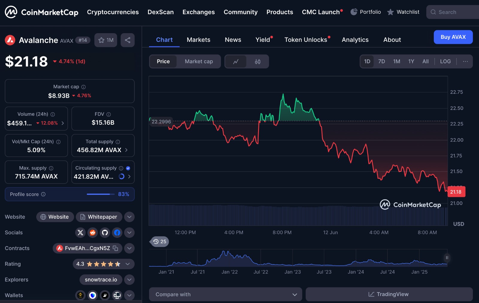 As of June 12, 2025, the AVAX Coin Price is approximately $21.48 USD, with a 24-hour trading volume of over $457.9 million .