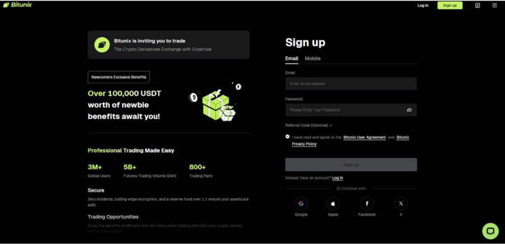 Go to Bitunix and sign up using your email and a secure password. Existing users can log in directly.