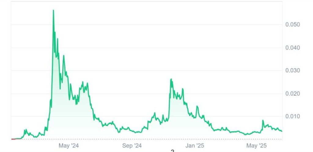As of June 19, 2025, DEGEN is trading at approximately $0.00344, with a 24-hour trading volume of $7.5 million and a market capitalization of around $75.69 million. The token reached an all-time high of $0.005626 in April 2024, shortly after the Degen Chain launch and Coinbase listing, and an all-time low of $0.000112 on January 2024 (right at the launch).