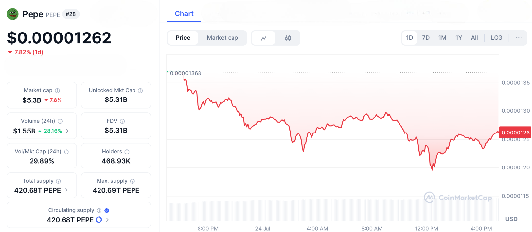 As of July 24, 2025, the Pepe Coin Price is around $0.000013, following a recent 5% dip.